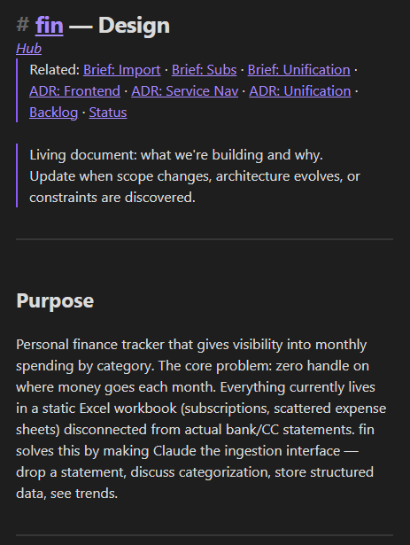 That’s the whole purpose, scope, and architecture — written by Claude after a 10-minute conversation where it asked me what I needed and I answered honestly.